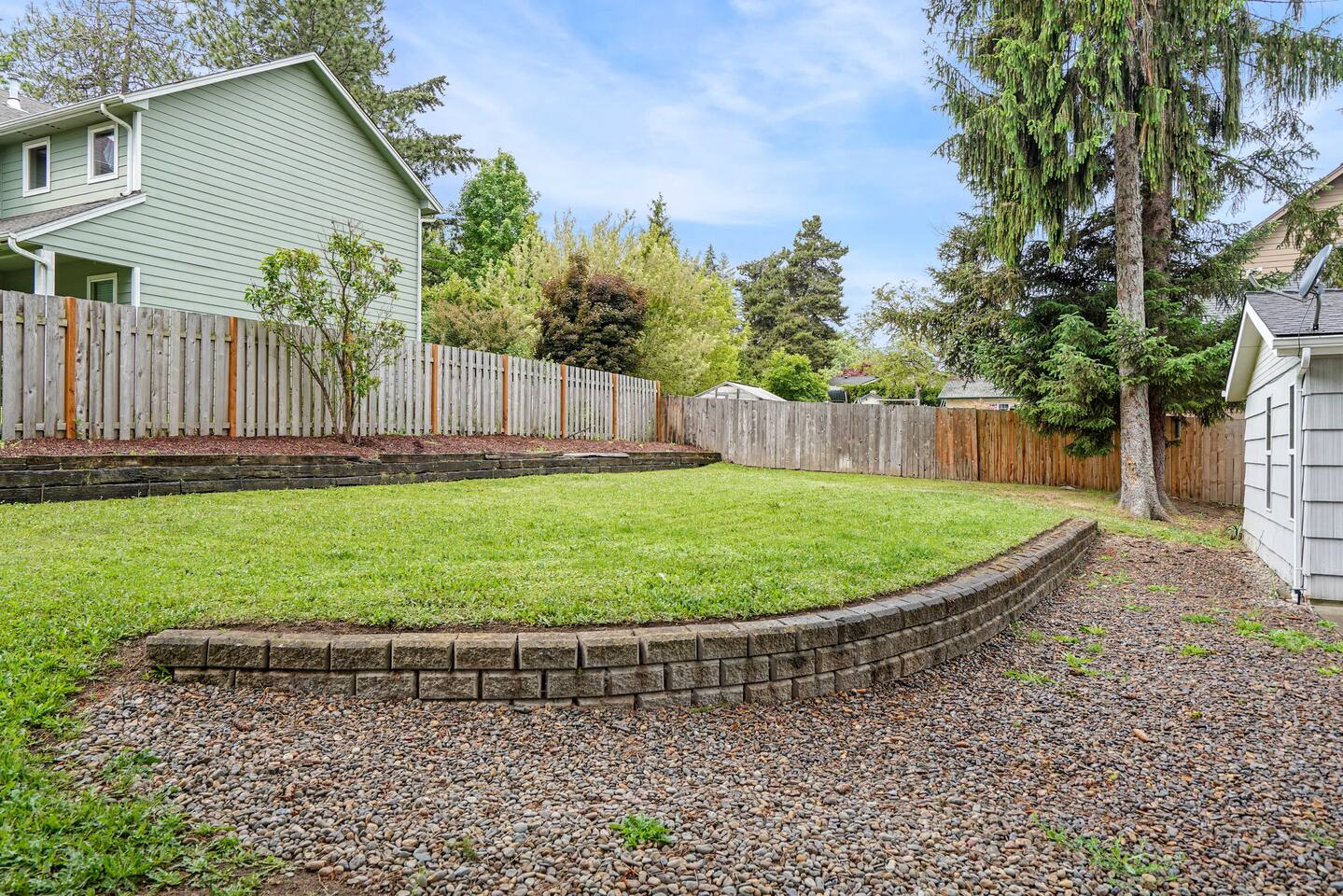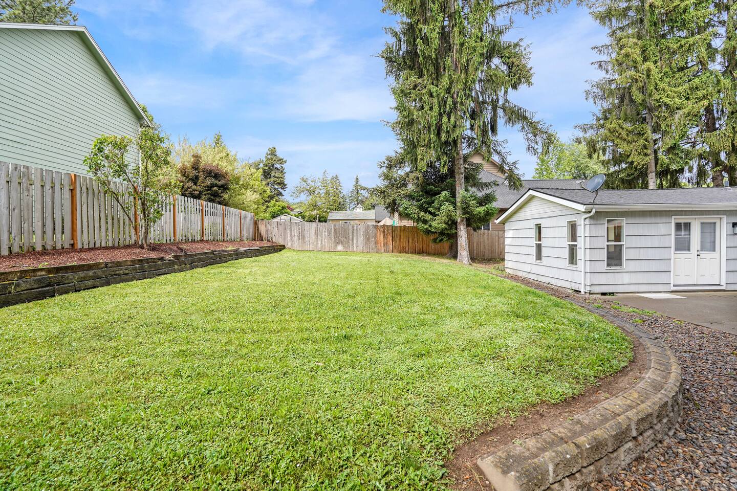 Backyard, main house, front yard, driveway (partial)